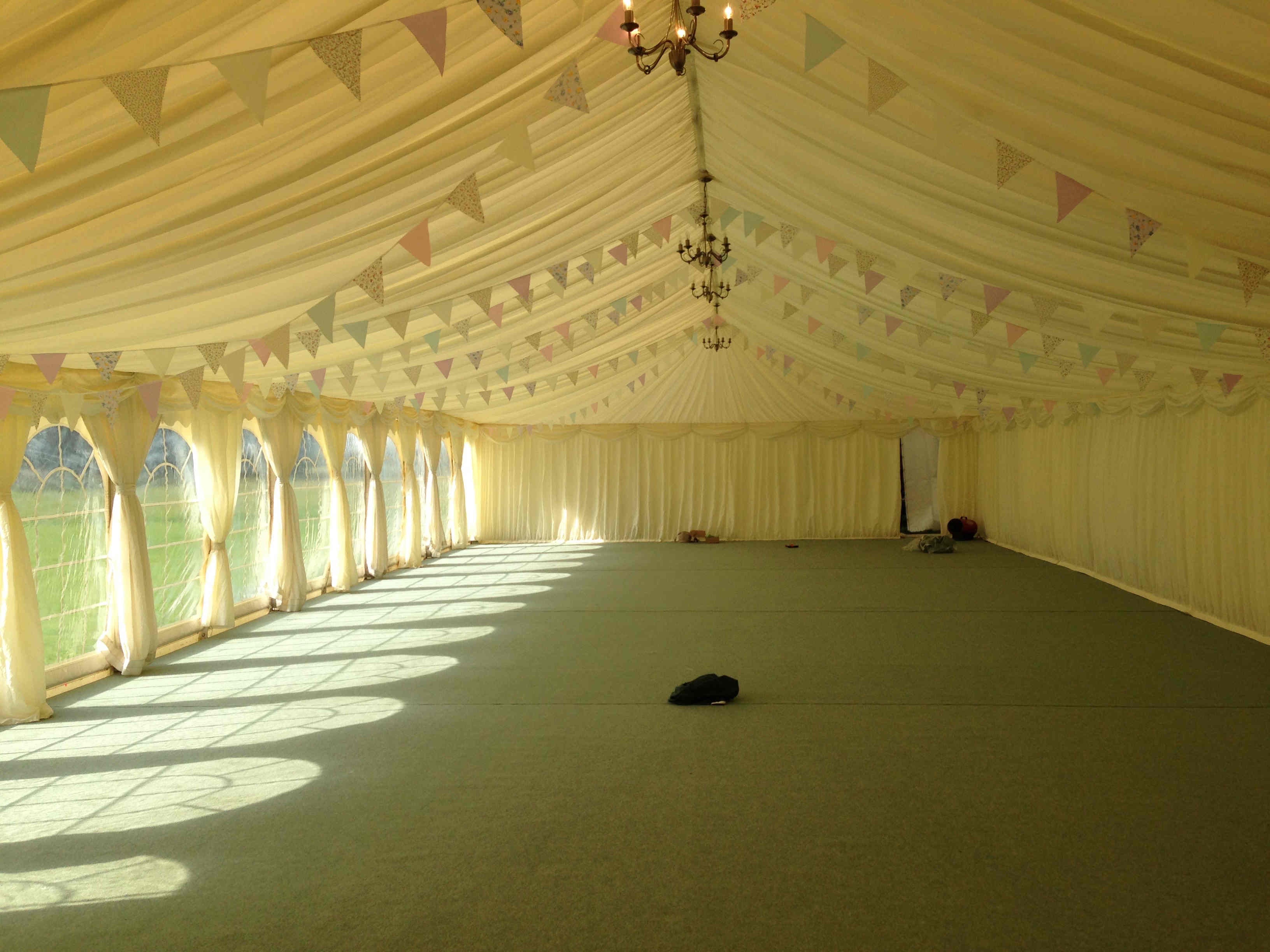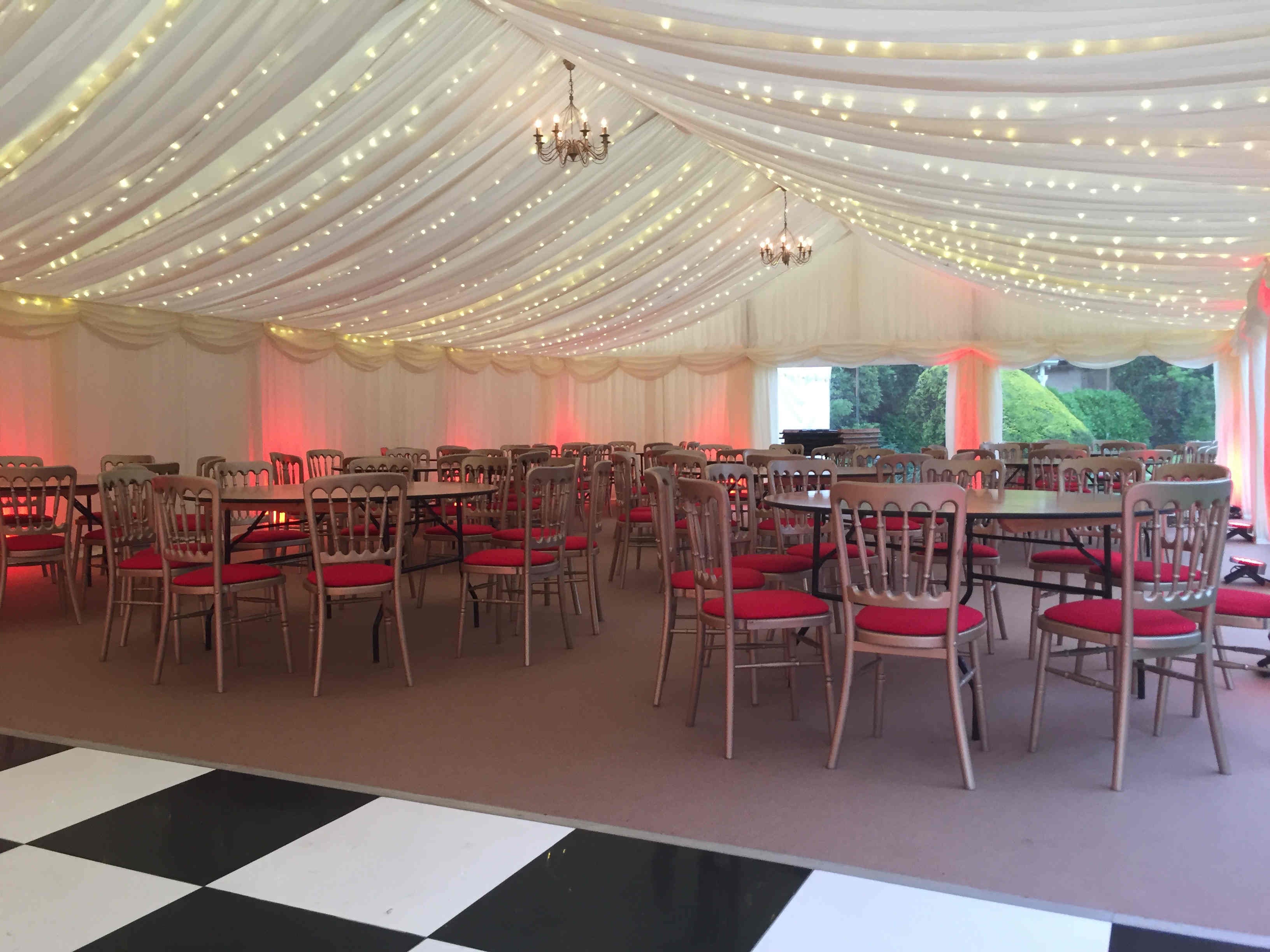 Standard lining comes in white, ivory or black you can choose from pleated linings, flat linings or even a bespoke fabric. We can add starlights to black lining to make your marquee have a night sky effect.